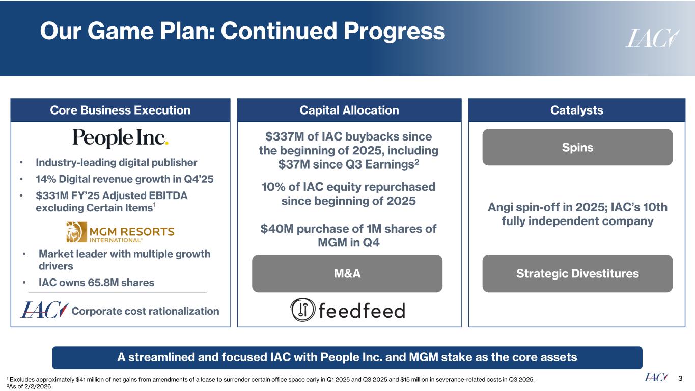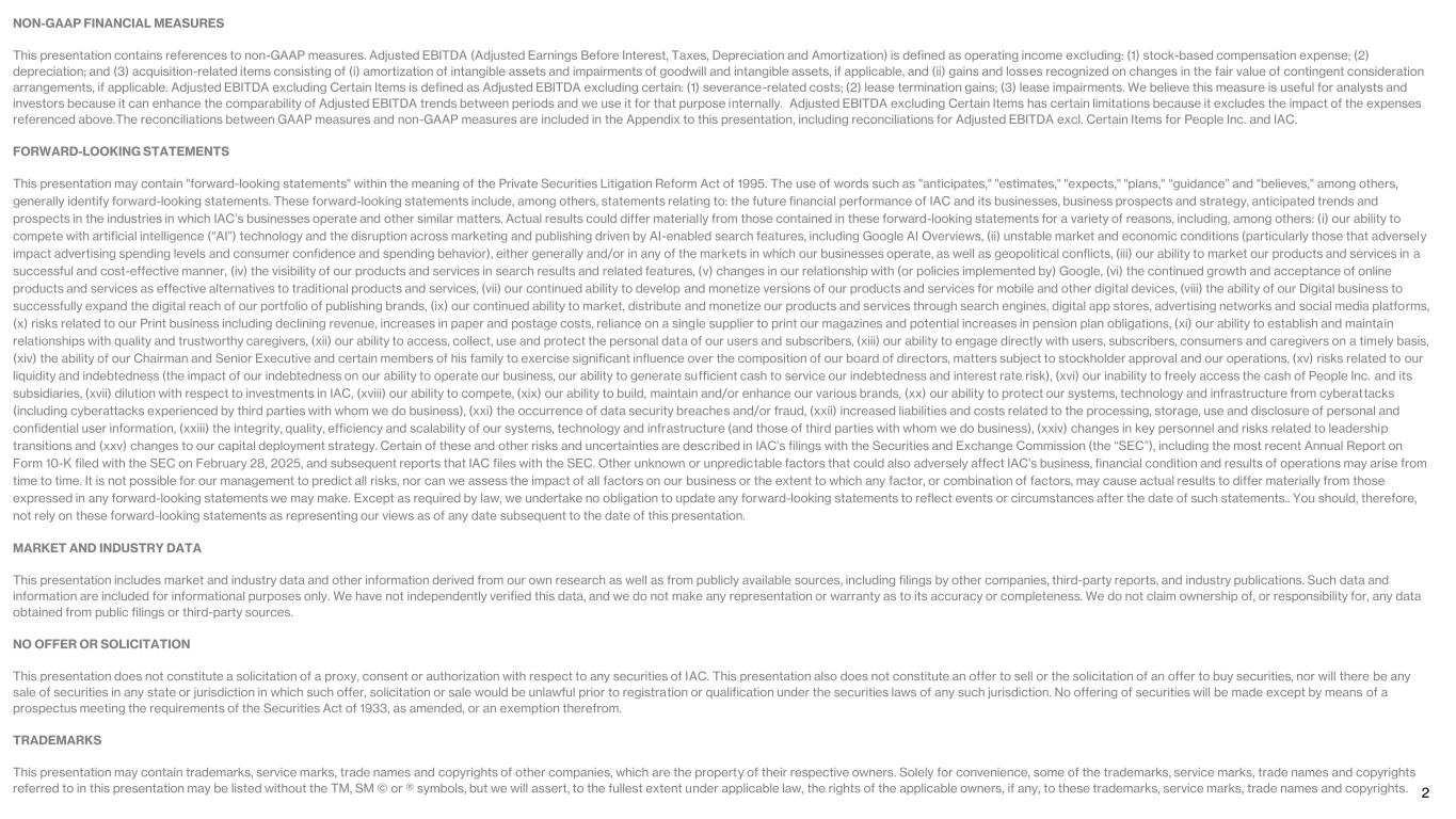 2 NON-GAAP FINANCIAL MEASURES This presentation contains references to non-GAAP measures. Adjusted EBITDA (Adjusted Earnings Before Interest, Taxes, Depreciation and Amortization) is defined as operating income excluding: (1) stock-based compensation expense; (2) depreciation; and (3) acquisition-related items consisting of (i) amortization of intangible assets and impairments of goodwill and intangible assets, if applicable, and (ii) gains and losses recognized on changes in the fair value of contingent consideration arrangements, if applicable. Adjusted EBITDA excluding Certain Items is defined as Adjusted EBITDA excluding certain: (1) severance-related costs; (2) lease termination gains; (3) lease impairments. We believe this measure is useful for analysts and investors because it can enhance the comparability of Adjusted EBITDA trends between periods and we use it for that purpose internally. Adjusted EBITDA excluding Certain Items has certain limitations because it excludes the impact of the expenses referenced above.The reconciliations between GAAP measures and non-GAAP measures are included in the Appendix to this presentation, including reconciliations for Adjusted EBITDA excl. Certain Items for People Inc. and IAC. FORWARD-LOOKING STATEMENTS This presentation may contain "forward-looking statements" within the meaning of the Private Securities Litigation Reform Act of 1995. The use of words such as "anticipates," "estimates," "expects," "plans," “guidance” and "believes," among others, generally identify forward-looking statements. These forward-looking statements include, among others, statements relating to: the future financial performance of IAC and its businesses, business prospects and strategy, anticipated trends and prospects in the industries in which IAC’s businesses operate and other similar matters. Actual results could differ materially from those contained in these forward-looking statements for a variety of reasons, including, among others: (i) our ability to compete with artificial intelligence (“AI”) technology and the disruption across marketing and publishing driven by AI-enabled search features, including Google AI Overviews, (ii) unstable market and economic conditions (particularly those that adversely impact advertising spending levels and consumer confidence and spending behavior), either generally and/or in any of the markets in which our businesses operate, as well as geopolitical conflicts, (iii) our ability to market our products and services in a successful and cost-effective manner, (iv) the visibility of our products and services in search results and related features, (v) changes in our relationship with (or policies implemented by) Google, (vi) the continued growth and acceptance of online products and services as effective alternatives to traditional products and services, (vii) our continued ability to develop and monetize versions of our products and services for mobile and other digital devices, (viii) the ability of our Digital business to successfully expand the digital reach of our portfolio of publishing brands, (ix) our continued ability to market, distribute and monetize our products and services through search engines, digital app stores, advertising networks and social media platforms, (x) risks related to our Print business including declining revenue, increases in paper and postage costs, reliance on a single supplier to print our magazines and potential increases in pension plan obligations, (xi) our ability to establish and maintain relationships with quality and trustworthy caregivers, (xii) our ability to access, collect, use and protect the personal data of our users and subscribers, (xiii) our ability to engage directly with users, subscribers, consumers and caregivers on a timely basis, (xiv) the ability of our Chairman and Senior Executive and certain members of his family to exercise significant influence over the composition of our board of directors, matters subject to stockholder approval and our operations, (xv) risks related to our liquidity and indebtedness (the impact of our indebtedness on our ability to operate our business, our ability to generate sufficient cash to service our indebtedness and interest rate risk), (xvi) our inability to freely access the cash of People Inc. and its subsidiaries, (xvii) dilution with respect to investments in IAC, (xviii) our ability to compete, (xix) our ability to build, maintain and/or enhance our various brands, (xx) our ability to protect our systems, technology and infrastructure from cyberattacks (including cyberattacks experienced by third parties with whom we do business), (xxi) the occurrence of data security breaches and/or fraud, (xxii) increased liabilities and costs related to the processing, storage, use and disclosure of personal and confidential user information, (xxiii) the integrity, quality, efficiency and scalability of our systems, technology and infrastructure (and those of third parties with whom we do business), (xxiv) changes in key personnel and risks related to leadership transitions and (xxv) changes to our capital deployment strategy. Certain of these and other risks and uncertainties are described in IAC’s filings with the Securities and Exchange Commission (the “SEC”), including the most recent Annual Report on Form 10-K filed with the SEC on February 28, 2025, and subsequent reports that IAC files with the SEC. Other unknown or unpredictable factors that could also adversely affect IAC's business, financial condition and results of operations may arise from time to time. It is not possible for our management to predict all risks, nor can we assess the impact of all factors on our business or the extent to which any factor, or combination of factors, may cause actual results to differ materially from those expressed in any forward-looking statements we may make. Except as required by law, we undertake no obligation to update any forw