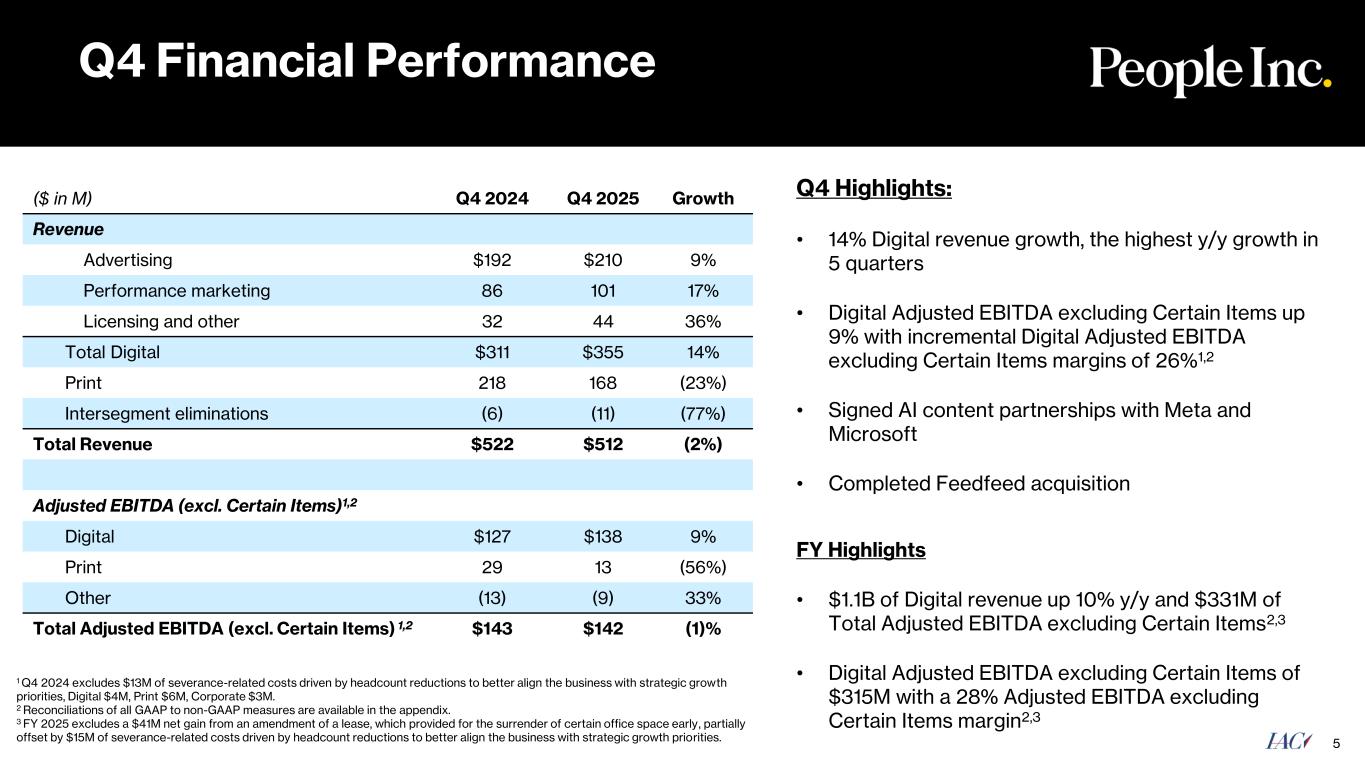 Our Game Plan: Continued Progress 3 • Market leader with multiple growth drivers • IAC owns 65.8M shares $337M of IAC buybacks since the beginning of 2025, including $37M since Q3 Earnings2 10% of IAC equity repurchased since beginning of 2025 $40M purchase of 1M shares of MGM in Q4 A streamlined and focused IAC with People Inc. and MGM stake as the core assets M&A Core Business Execution CatalystsCapital Allocation • Industry-leading digital publisher • 14% Digital revenue growth in Q4’25 • $331M FY’25 Adjusted EBITDA excluding Certain Items1 Corporate cost rationalization 1 Excludes approximately $41 million of net gains from amendments of a lease to surrender certain office space early in Q1 2025 and Q3 2025 and $15 million in severance-related costs in Q3 2025. 2As of 2/2/2026 Angi spin-off in 2025; IAC’s 10th fully independent company Strategic Divestitures Spins