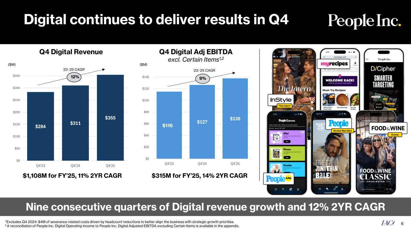 Q4 Financial Performance 5 ($ in M) Q4 2024 Q4 2025 Growth Revenue Advertising $192 $210 9% Performance marketing 86 101 17% Licensing and other 32 44 36% Total Digital $311 $355 14% Print 218 168 (23%) Intersegment eliminations (6) (11) (77%) Total Revenue $522 $512 (2%) Adjusted EBITDA (excl. Certain Items)1,2 Digital $127 $138 9% Print 29 13 (56%) Other (13) (9) 33% Total Adjusted EBITDA (excl. Certain Items) 1,2 $143 $142 (1)% Q4 Highlights: • 14% Digital revenue growth, the highest y/y growth in 5 quarters • Digital Adjusted EBITDA excluding Certain Items up 9% with incremental Digital Adjusted EBITDA excluding Certain Items margins of 26%1,2 • Signed AI content partnerships with Meta and Microsoft • Completed Feedfeed acquisition FY Highlights • $1.1B of Digital revenue up 10% y/y and $331M of Total Adjusted EBITDA excluding Certain Items2,3 • Digital Adjusted EBITDA excluding Certain Items of $315M with a 28% Adjusted EBITDA excluding Certain Items margin2,3 1 Q4 2024 excludes $13M of severance-related costs driven by headcount reductions to better align the business with strategic growth priorities, Digital $4M, Print $6M, Corporate $3M. 2 Reconciliations of all GAAP to non-GAAP measures are available in the appendix. 3 FY 2025 excludes a $41M net gain from an amendment of a lease, which provided for the surrender of certain office space early, partially offset by $15M of severance-related costs driven by headcount reductions to better align the business with strategic growth priorities.