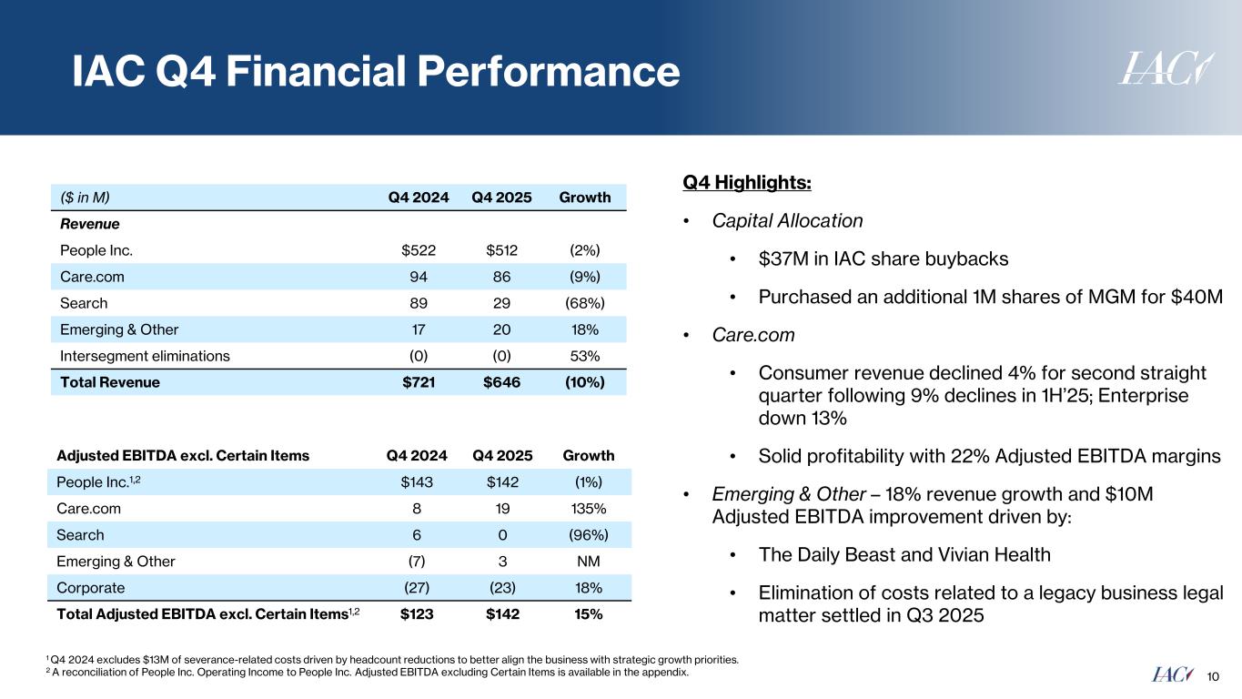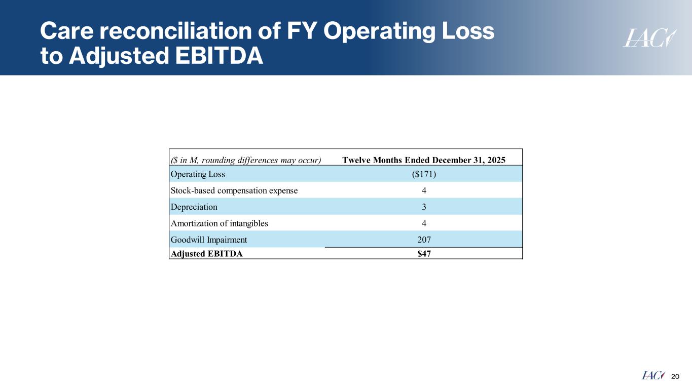 This press release and the IAC conference call, which will be held at 8:30 a.m. Eastern Time on Wednesday, February 4, 2026, may contain "forward-looking statements" within the meaning of the Private Securities Litigation Reform Act of 1995. The use of words such as "anticipates," "estimates," "expects," "plans," “guidance” and "believes," among others, generally identify forward-looking statements. These forward-looking statements include, among others, statements relating to: the future financial performance of IAC and its businesses, business prospects and strategy, anticipated trends and prospects in the industries in which IAC’s businesses operate and other similar matters. Actual results could differ materially from those contained in these forward-looking statements for a variety of reasons, including, among others: (i) our ability to compete with artificial intelligence (“AI”) technology and the disruption across marketing and publishing driven by AI-enabled search features, including Google AI Overviews, (ii) unstable market and economic conditions (particularly those that adversely impact advertising spending levels and consumer confidence and spending behavior), either generally and/or in any of the markets in which our businesses operate, as well as geopolitical conflicts, (iii) our ability to market our products and services in a successful and cost-effective manner, (iv) the visibility of our products and services in search results and related features, (v) changes in our relationship with (or policies implemented by) Google, (vi) the continued growth and acceptance of online products and services as effective alternatives to traditional products and services, (vii) our continued ability to develop and monetize versions of our products and services for mobile and other digital devices, (viii) the ability of our Digital business to successfully expand the digital reach of our portfolio of publishing brands, (ix) our continued ability to market, distribute and monetize our products and services through search engines, digital app stores, advertising networks and social media platforms, (x) risks related to our Print business including declining revenue, increases in paper and postage costs, reliance on a single supplier to print our magazines and potential increases in pension plan obligations, (xi) our ability to establish and maintain relationships with quality and trustworthy caregivers, (xii) our ability to access, collect, use and protect the personal data of our users and subscribers, (xiii) our ability to engage directly with users, subscribers, consumers and caregivers on a timely basis, (xiv) the ability of our Chairman and Senior Executive and certain members of his family to exercise significant influence over the composition of our board of directors, matters subject to stockholder approval and our operations, (xv) risks related to our liquidity and indebtedness (the impact of our indebtedness on our ability to operate our business, our ability to generate sufficient cash to service our indebtedness and interest rate risk), (xvi) our inability to freely access the cash of People Inc. and its subsidiaries, (xvii) dilution with respect to investments in IAC, (xviii) our ability to compete, (xix) our ability to build, maintain and/or enhance our various brands, (xx) our ability to protect our systems, technology and infrastructure from cyberattacks (including cyberattacks experienced by third parties with whom we do business), (xxi) the occurrence of data security breaches and/or fraud, (xxii) increased liabilities and costs related to the processing, storage, use and disclosure of personal and confidential user information, (xxiii) the integrity, quality, efficiency and scalability of our systems, technology and infrastructure (and those of third parties with whom we do business), (xxiv) changes in key personnel and risks related to leadership transitions and (xxv) changes to our capital deployment strategy. Certain of these and other risks and uncertainties are described in IAC’s filings with the Securities and Exchange Commission (the “SEC”), including the most recent Annual Report on Form 10-K filed with the SEC on February 28, 2025, and subsequent reports that IAC files with the SEC. Other unknown or unpredictable factors that could also adversely affect IAC's business, financial condition and results of operations may arise from time to time. It is not possible for our management to predict all risks, nor can we assess the impact of all factors on our business or the extent to which any factor, or combination of factors, may cause actual results to differ materially from those expressed in any forward-looking statements we may make. Except as required by law, we undertake no obligation to update any forward-looking statements to reflect events or circumstances after the date of such statements. You should, therefore, not rely on these forward-looking statements as representing our views as of any date subsequent to the date of this press release.