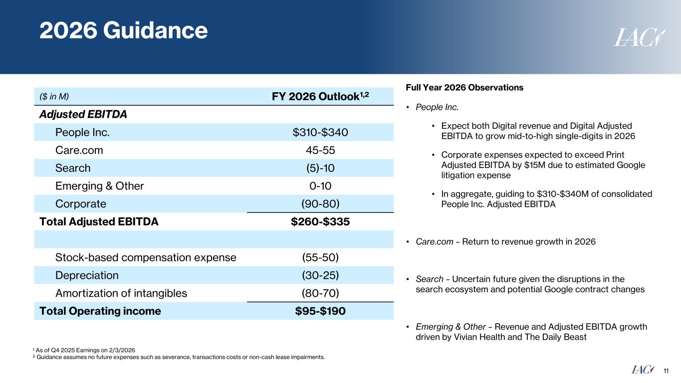 IAC Q4 Financial Performance 10 ($ in M) Q4 2024 Q4 2025 Growth Revenue People Inc. $522 $512 (2%) Care.com 94 86 (9%) Search 89 29 (68%) Emerging & Other 17 20 18% Intersegment eliminations (0) (0) 53% Total Revenue $721 $646 (10%) Adjusted EBITDA excl. Certain Items Q4 2024 Q4 2025 Growth People Inc.1,2 $143 $142 (1%) Care.com 8 19 135% Search 6 0 (96%) Emerging & Other (7) 3 NM Corporate (27) (23) 18% Total Adjusted EBITDA excl. Certain Items1,2 $123 $142 15% Q4 Highlights: • Capital Allocation • $37M in IAC share buybacks • Purchased an additional 1M shares of MGM for $40M • Care.com • Consumer revenue declined 4% for second straight quarter following 9% declines in 1H’25; Enterprise down 13% • Solid profitability with 22% Adjusted EBITDA margins • Emerging & Other – 18% revenue growth and $10M Adjusted EBITDA improvement driven by: • The Daily Beast and Vivian Health • Elimination of costs related to a legacy business legal matter settled in Q3 2025 1 Q4 2024 excludes $13M of severance-related costs driven by headcount reductions to better align the business with strategic growth priorities. 2 A reconciliation of People Inc. Operating Income to People Inc. Adjusted EBITDA excluding Certain Items is available in the appendix.
