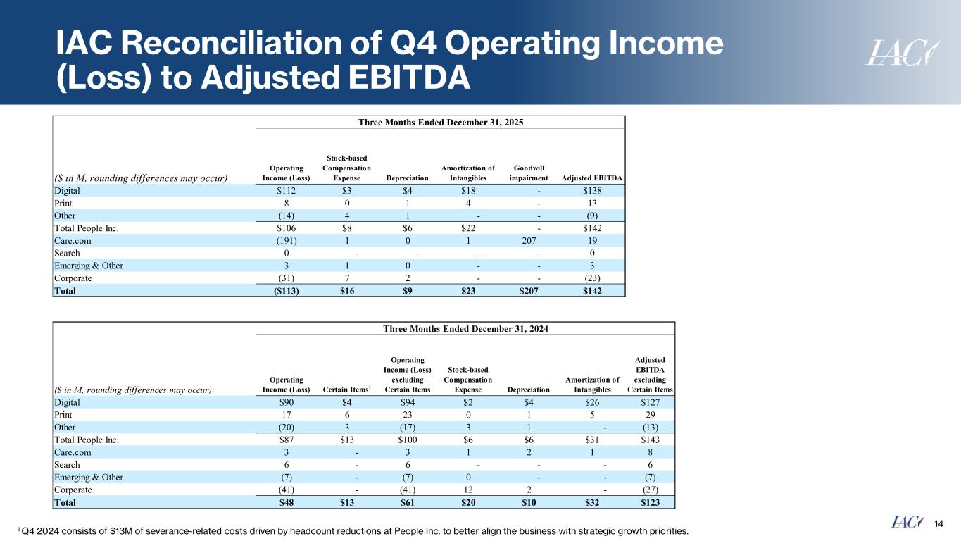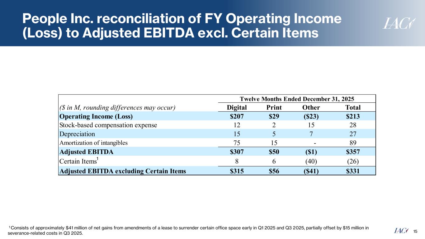 IAC Reconciliation of Q4 Operating Income (Loss) to Adjusted EBITDA 14 1 Q4 2024 consists of $13M of severance-related costs driven by headcount reductions at People Inc. to better align the business with strategic growth priorities. Three Months Ended December 31, 2025 ($ in M, rounding differences may occur) Operating Income (Loss) Stock-based Compensation Expense Depreciation Amortization of Intangibles Goodwill impairment Adjusted EBITDA Digital $112 $3 $4 $18 - $138 Print 8 0 1 4 - 13 Other (14) 4 1 - - (9) Total People Inc. $106 $8 $6 $22 - $142 Care.com (191) 1 0 1 207 19 Search 0 - - - - 0 Emerging & Other 3 1 0 - - 3 Corporate (31) 7 2 - - (23) Total ($113) $16 $9 $23 $207 $142 Three Months Ended December 31, 2024 ($ in M, rounding differences may occur) Operating Income (Loss) Certain Items 1 Operating Income (Loss) excluding Certain Items Stock-based Compensation Expense Depreciation Amortization of Intangibles Adjusted EBITDA excluding Certain Items Digital $90 $4 $94 $2 $4 $26 $127 Print 17 6 23 0 1 5 29 Other (20) 3 (17) 3 1 - (13) Total People Inc. $87 $13 $100 $6 $6 $31 $143 Care.com 3 - 3 1 2 1 8 Search 6 - 6 - - - 6 Emerging & Other (7) - (7) 0 - - (7) Corporate (41) - (41) 12 2 - (27) Total $48 $13 $61 $20 $10 $32 $123
