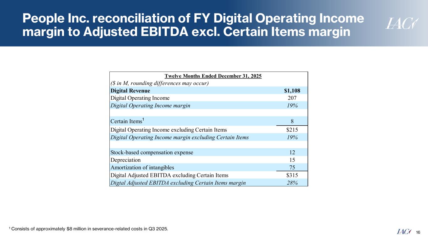 People Inc. reconciliation of FY Operating Income (Loss) to Adjusted EBITDA excl. Certain Items 15 1 Consists of approximately $41 million of net gains from amendments of a lease to surrender certain office space early in Q1 2025 and Q3 2025, partially offset by $15 million in severance-related costs in Q3 2025. Twelve Months Ended December 31, 2025 ($ in M, rounding differences may occur) Digital Print Other Total Operating Income (Loss) $207 $29 ($23) $213 Stock-based compensation expense 12 2 15 28 Depreciation 15 5 7 27 Amortization of intangibles 75 15 - 89 Adjusted EBITDA $307 $50 ($1) $357 Certain Items 8 6 (40) (26) Adjusted EBITDA excluding Certain Items $315 $56 ($41) $331 1