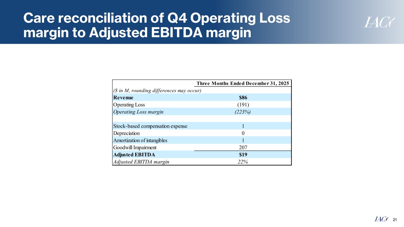 Care reconciliation of FY Operating Loss to Adjusted EBITDA 20 ($ in M, rounding differences may occur) Twelve Months Ended December 31, 2025 Operating Loss ($171) Stock-based compensation expense 4 Depreciation 3 Amortization of intangibles 4 Goodwill Impairment 207 Adjusted EBITDA $47